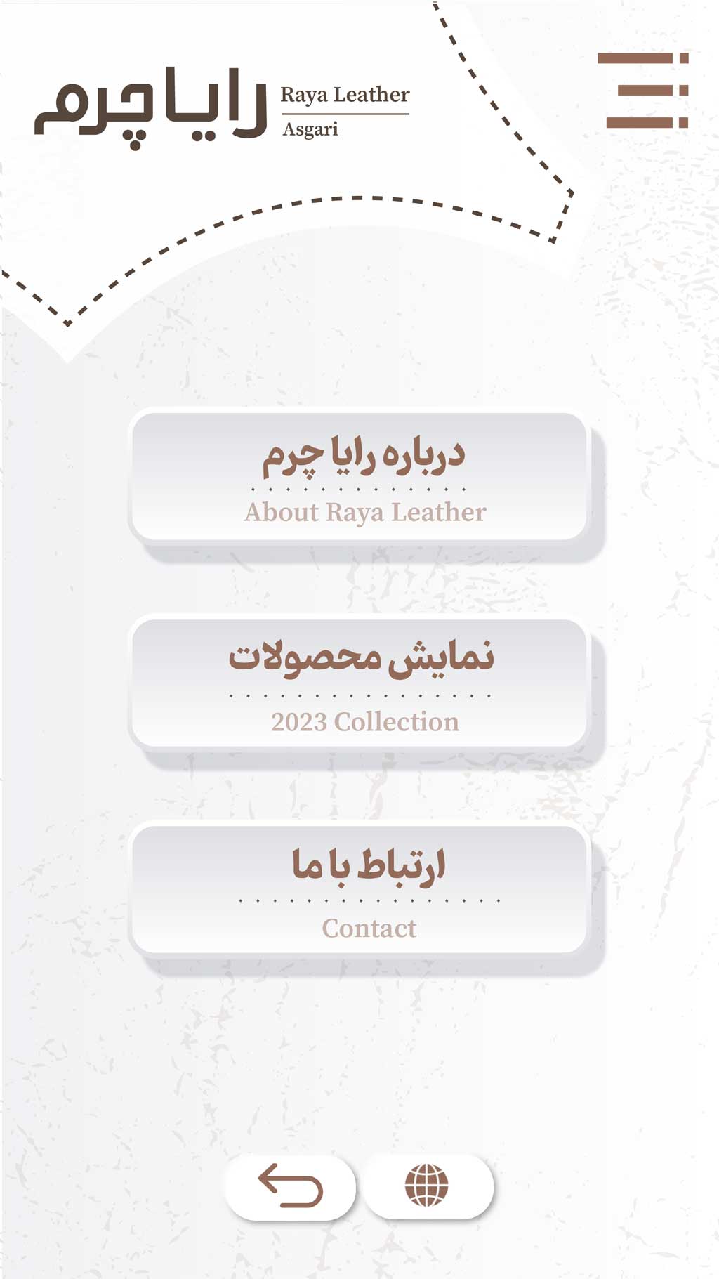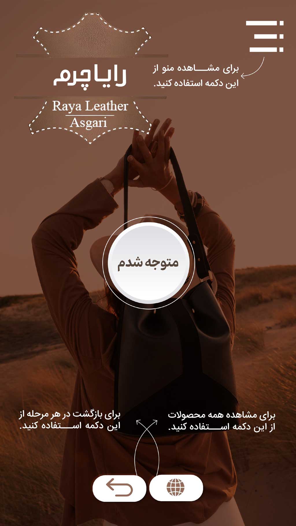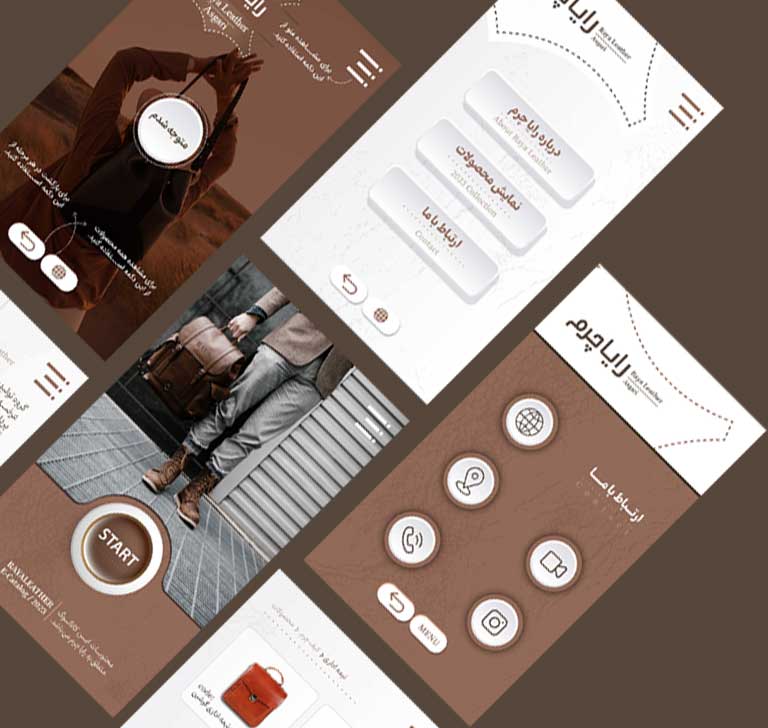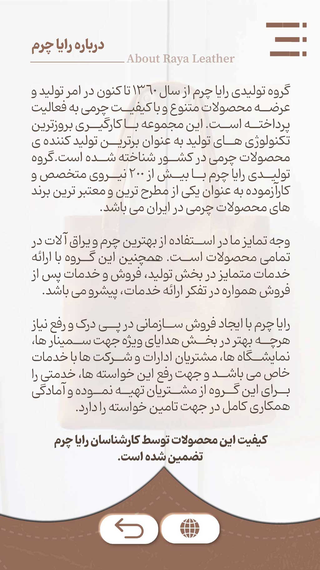 نمونه کاتالوگ دیجیتال رایا چرم، یکی از نمونه کاتالوگ های اسمارت غرفه ای این برند بوده. هدف برند رایا چرم از این طراحی راحتتر کردن مشاهده اجناس و تولیدات این برند توسط مشتریان است. همانطور که در صفحات کاتالوگ رایا چرم (RAYALEATHER) مشاهده می کنید، اطلاعاتی همچون درباره، محصولات و راه های ارتباطی با برند در این کاتالوگ مورد نیاز بود و اجرا شده است. این کاتالوگ در 16 صفحه، 3 دسته بندی محصول و 10 زیر دسته جهت نمایش 24 محصول برتر به صورت خلاصه برای نمایش سریعتر به مخاطب در نظر گرفته شده.